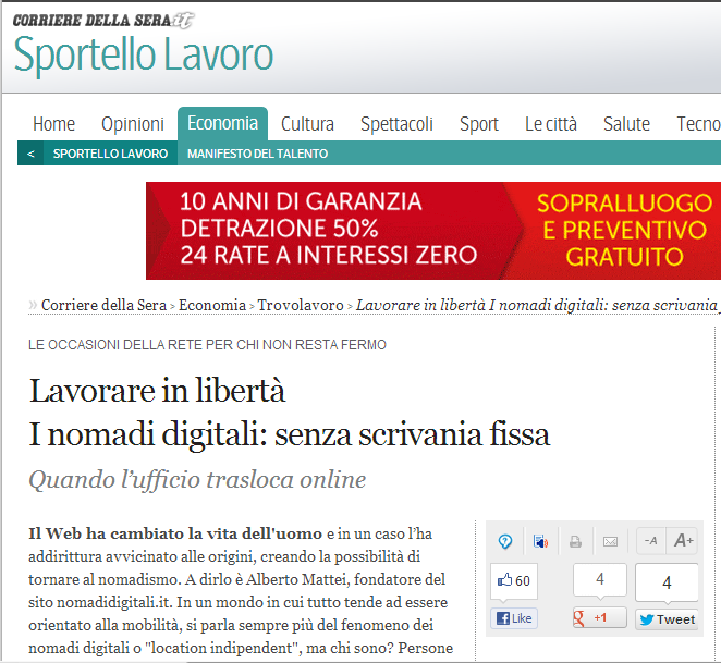 Lavorare in libertà. I nomadi digitali: senza scrivania fissa“: l’articolo di Giulia Cimpanelli sulle occasioni della Rete per chi non sta fermo, uscito nella sezione Sportello Lavoro del Corriere.it.