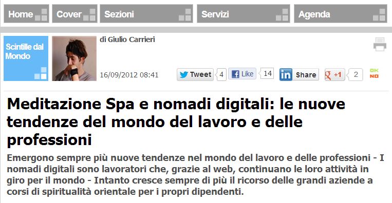 Meditazione Spa e nomadi digitali: le nuove tendenze del mondo del lavoro e delle professioni“: l’articolo di Giulio Carrieri sulle nuove tendenze nel mondo del lavoro e delle professioni.