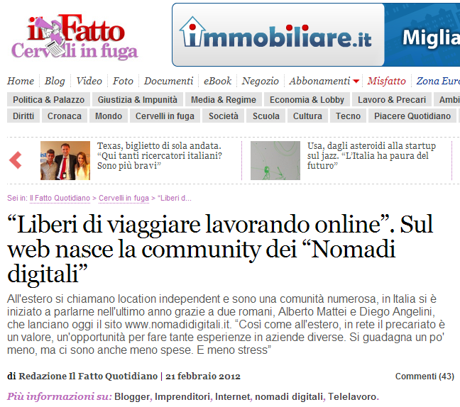Liberi di viaggiare lavorando online. Sul web nasce la community dei Nomadi Digitali”: Eleonora Cipollina racconta ai lettori dell’edizione online de Il Fatto Quotidiano dell’arrivo, anche in Italia, dei nomadi digitali, una comunità ormai numerosa in tutto il mondo!